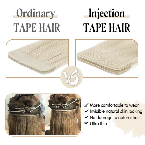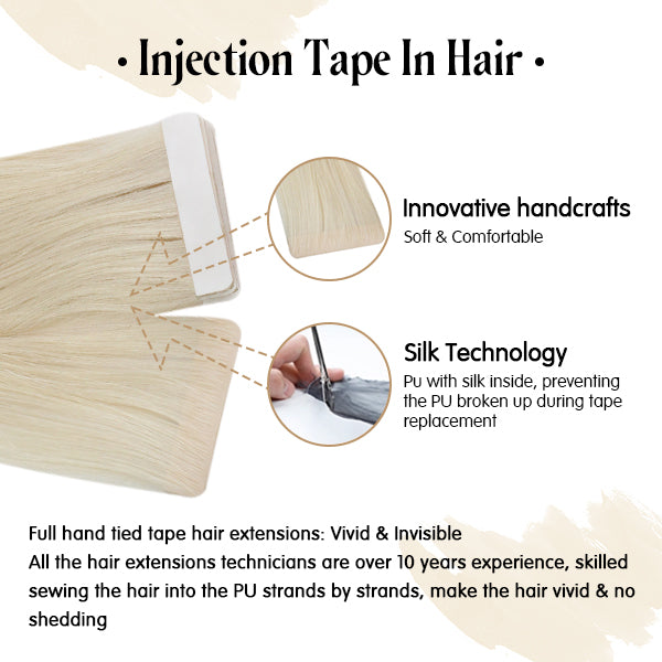 Injection Tape in Hair: The new product in the market, the hair seems growing from your own scalp as skin weft, but no short hair at top, ultra thin, very comfortable to wear, last more than 1 year and tangle free, pure real Virgin human hair quality, best and highest in the market, can compete with any famous hair companies.